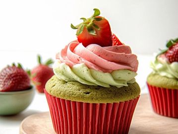 moist matcha cake withfresh strawberry buttercream topping